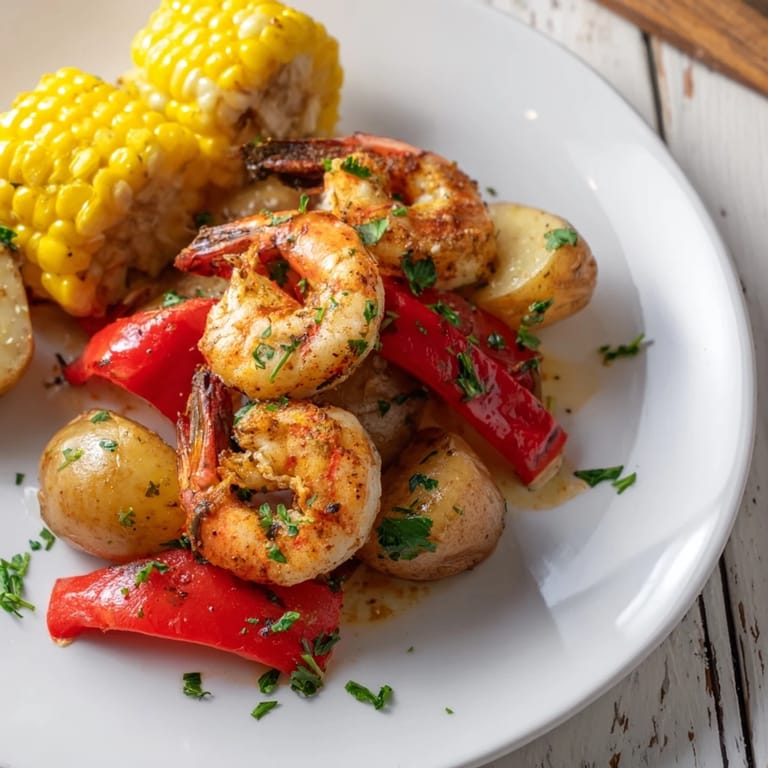 Save to Pinterest A vibrant, flavor-packed platter featuring spicy Cajun shrimp, sweet corn on the cob, and roasted potatoes, perfect for a festive meal or summer gathering.