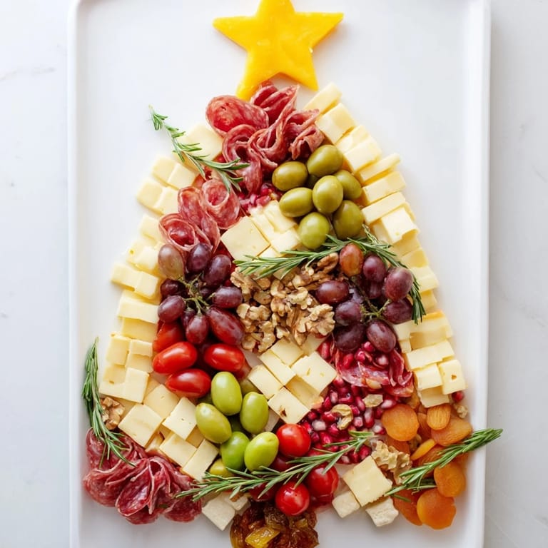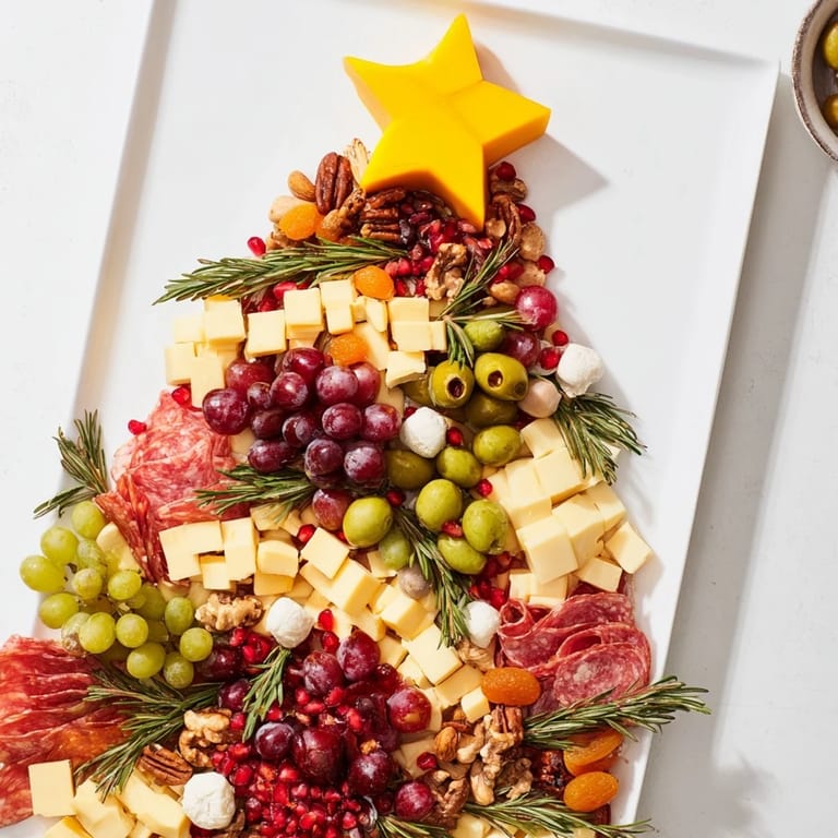 Save to Pinterest A festive and visually stunning charcuterie board arranged in the shape of a Christmas tree featuring an assortment of cured meats cheeses fruits and savory accompaniments perfect for holiday gatherings.