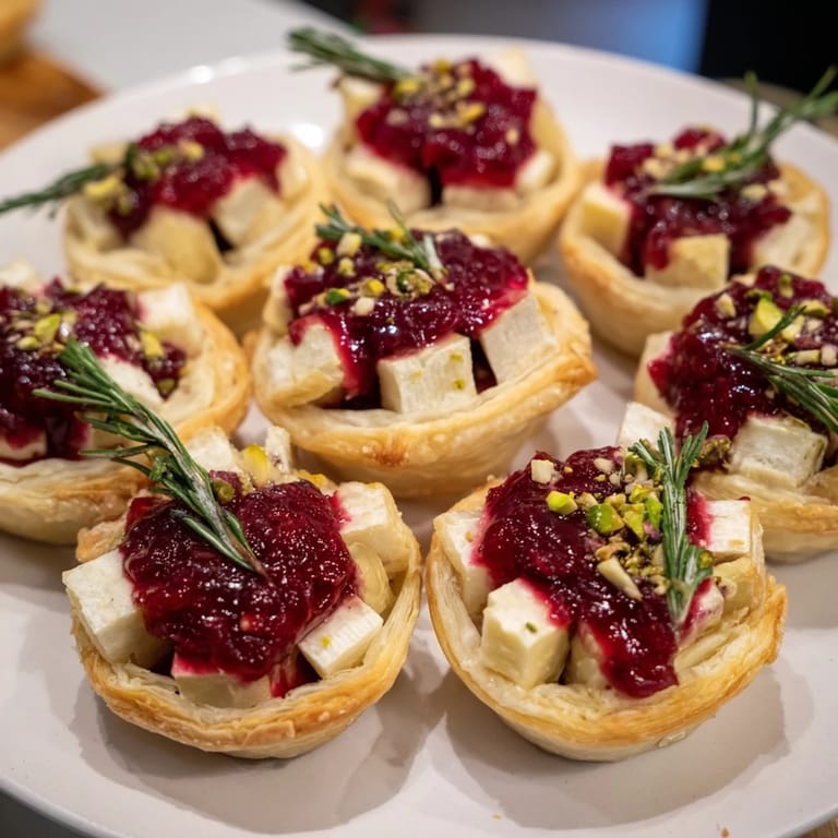 Save to Pinterest A festive, savory tartlet arrangement featuring creamy brie, tangy cranberry sauce, and golden puff pastry, perfect for holiday gatherings.