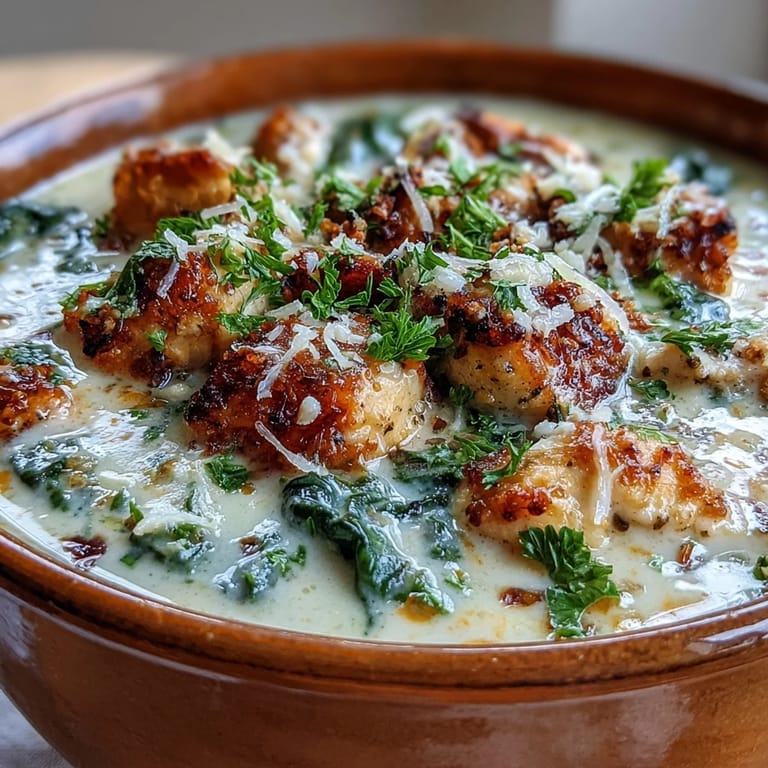 Save to Pinterest My kitchen window was foggy from the steam when I first threw this soup together on a night I was craving something cozy but didn't have time to fuss. I had chicken in the fridge, a wedge of Parmesan getting hard in the drawer, and garlic that needed using. What started as pantry improvisation turned into one of those recipes I make when I need a hug in a bowl. The smell of garlic blooming in olive oil still makes me think of that first batch, and how I stood at the stove stirring Parmesan into the cream, watching it melt into silk.