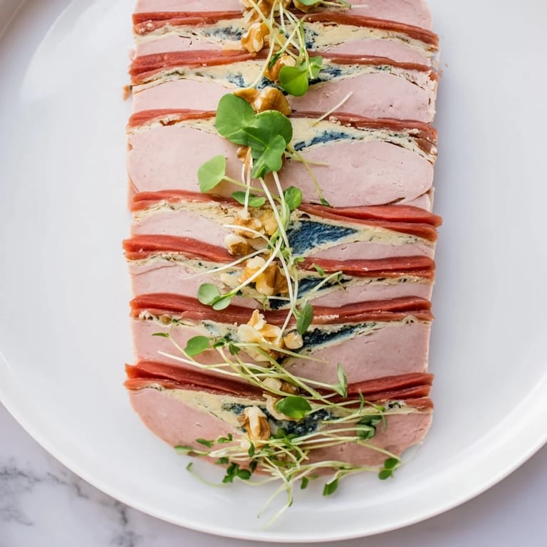 - Carefully unmold onto a serving platter by peeling back the plastic wrap and sliding the terrine out, then slice thickly with a sharp knife, using a gentle sawing motion. The cross-section is your masterpiece—those layers and that blue cheese river running through should be perfectly visible.
