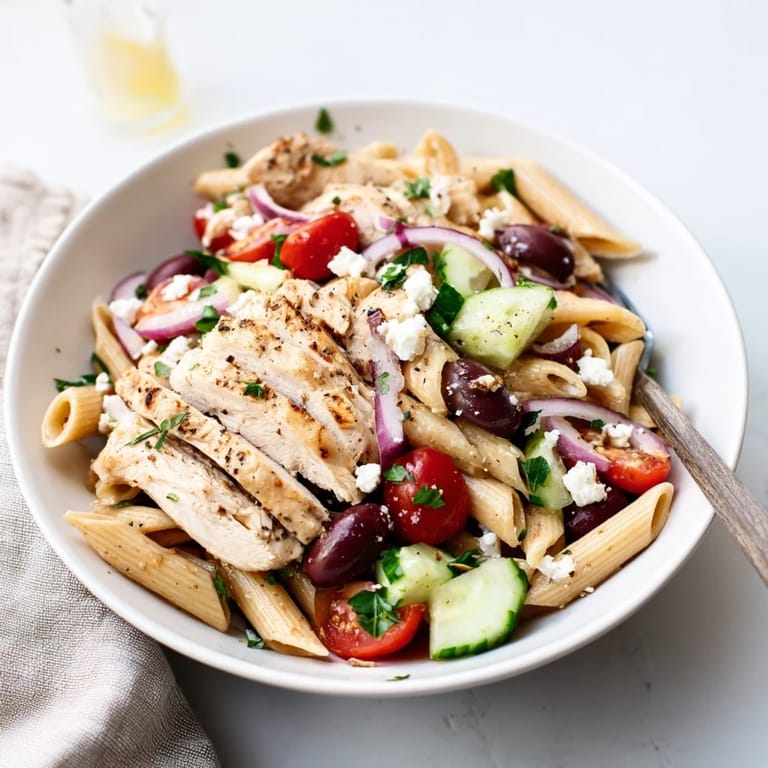 Save to Pinterest Experience a refreshing taste of the Mediterranean with this Greek Chicken Pasta Bowl. This vibrant dish combines tender, zesty lemon-marinated chicken with crisp cucumbers, juicy cherry tomatoes, and the creamy richness of crumbled feta. Perfect for a quick weeknight dinner or a healthy meal prep option, it brings together bold Greek flavors in one satisfying bowl.