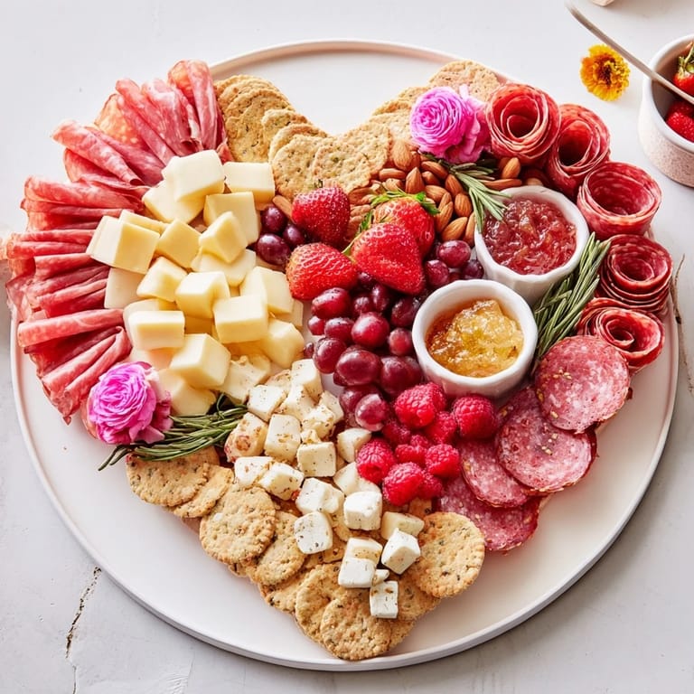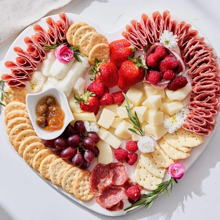 Save to Pinterest Celebrate love and friendship with this charming Heart-Shaped Charcuterie Board. Carefully arranged to delight the eyes and palate, this elegant appetizer features a colorful array of cured meats, assorted cheeses, juicy fruits, and savory accompaniments, all shaped into a romantic heart. Whether you're preparing for a special occasion or simply want to impress guests, this easy-to-assemble platter brings a touch of sophistication to any gathering.