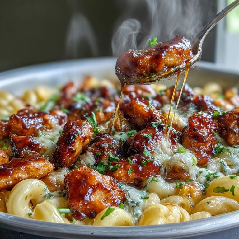 Save to Pinterest I scrolled past this dish on my phone at midnight, half-asleep, and somehow ended up in my kitchen at 10 AM the next day hunting for honey and BBQ sauce. There's something about the way crispy chicken bites swim in creamy cheddar pasta that just hits different, especially when that sweet and smoky glaze does the heavy lifting. My kids actually asked for seconds without complaint, which felt like winning the dinner lottery. It's the kind of meal that looks fancy enough to impress but comes together in one skillet while you're still figuring out what day it is.