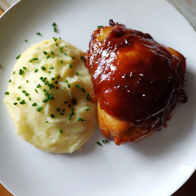 Save to Pinterest Succulent, oven-baked chicken thighs glazed in a sticky honey BBQ sauce, served with creamy garlic mashed potatoes for a comforting and flavorful meal.