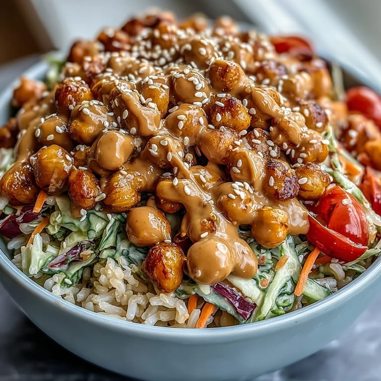 Save to Pinterest Last Tuesday, I was scrolling through my phone between meetings when a coworker mentioned she'd been living on sad desk salads for weeks. Something about that complaint stuck with me—not because I judged her choices, but because I remembered feeling exactly that way until I discovered how to build a bowl that actually satisfies. That afternoon, I threw together roasted chickpeas, vegetables, and a peanut sauce that tasted like it belonged in a restaurant, and suddenly lunch became something I looked forward to. This bowl changed how I think about weekday eating.