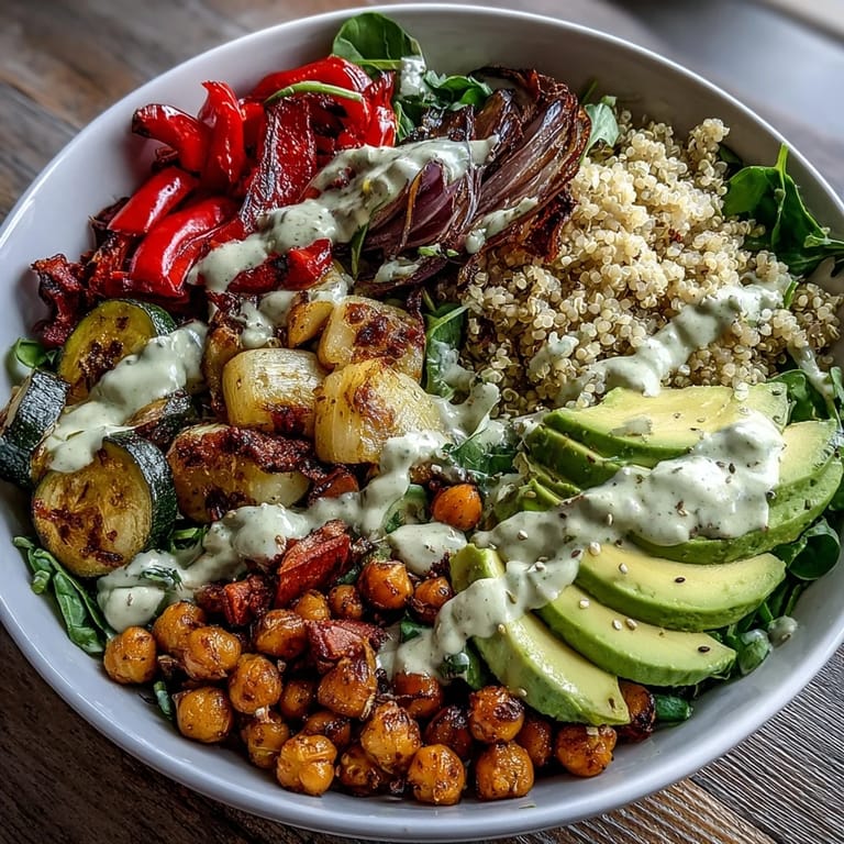 This bowl rewards planning because you can roast everything the night before and store it in separate containers, then assemble fresh in the morning with no more effort than arranging components on greens. The roasted chickpeas and vegetables stay crispy for three days in an airtight container, the dressing lasts even longer, and the grains hold up beautifully, so you could theoretically prep an entire week's worth of components on Sunday. Just keep the greens and avocado separate until you're ready to eat, assemble the bowl, and drizzle the dressing right before you dig in.