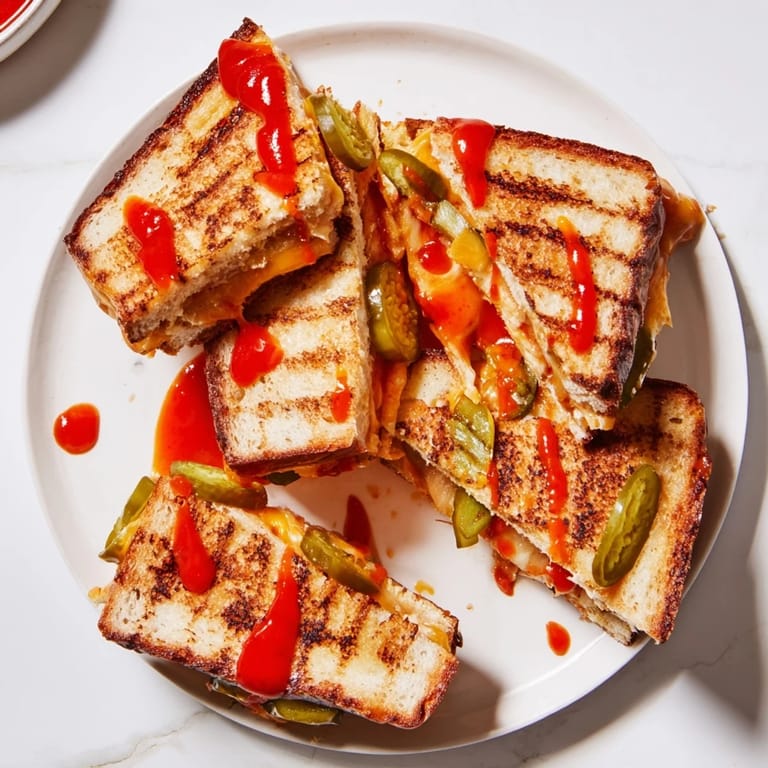 - Distribute the dill pickles, fresh jalapeno slices (if using), and chopped pickled jalapenos over the cheese. Drizzle hot sauce over the pickles on each sandwich.