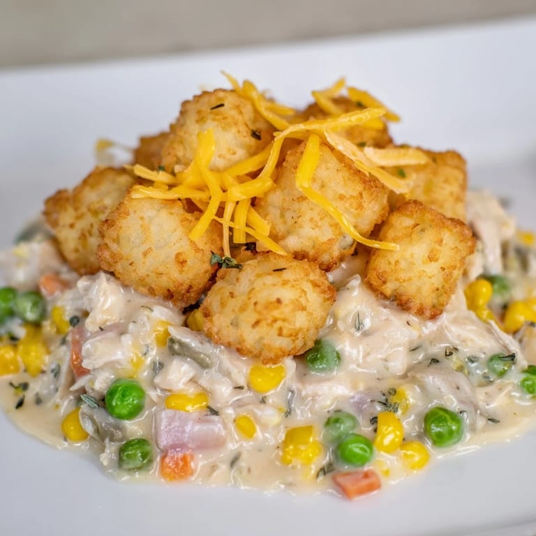 Save to Pinterest A comforting twist on the classic chicken pot pie, topped with crispy tater tots instead of pastry. Budget-friendly, hearty, and perfect for family dinners.